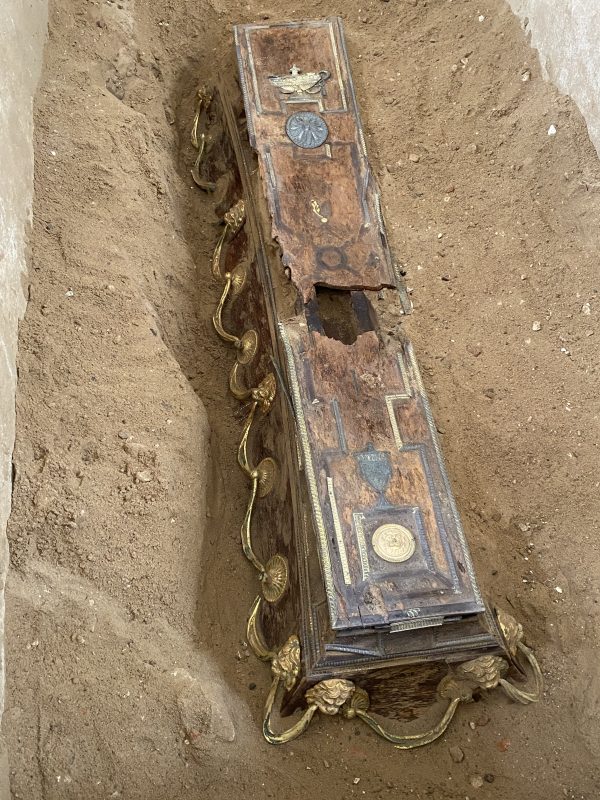 Nun ist die Anonymität Geschichte. Erst fanden wir 2020 an der Panke die Stelle, an dem sich das Kenotaph befand – es wurde 2023 wieder aufgestellt – und jetzt, am 8. Juli 2025, wurde bei der umfangreichen Kirchensanierung Julies Grab (wieder-)entdeckt. Bei Grabungen im Fußboden sei man in 40 cm Tiefe auf eine alte Steinmauer um einen rechteckigen Hohlraum gestoßen. Nach Freilegung der oberen Sandschichten konnte dann der Sand „nur noch mit Pinsel und Kelle abgetragen werden“, berichtet Stefan Kretzschmar, der bei der Aktion unter Verantwortung des Landesdenkmalamtes dabei war. Zum Vorschein kam der Schmuckdeckel eines darunter befindlichen Holzsarges. Die zahlreichen vergoldeten Leisten und Medaillons – wie der gut sichtbare Löwenkopf – weisen auf eine adlige Grablege hin. „Zu 99 Prozent gehen wir davon aus, dass es sich um das Grab der Julie von Voß handelt“, sagt Kretzschmar. „Eine hundertprozentige Sicherheit würde nur die Öffnung des Sarges und ein DNA-Test am Skelett bringen.“