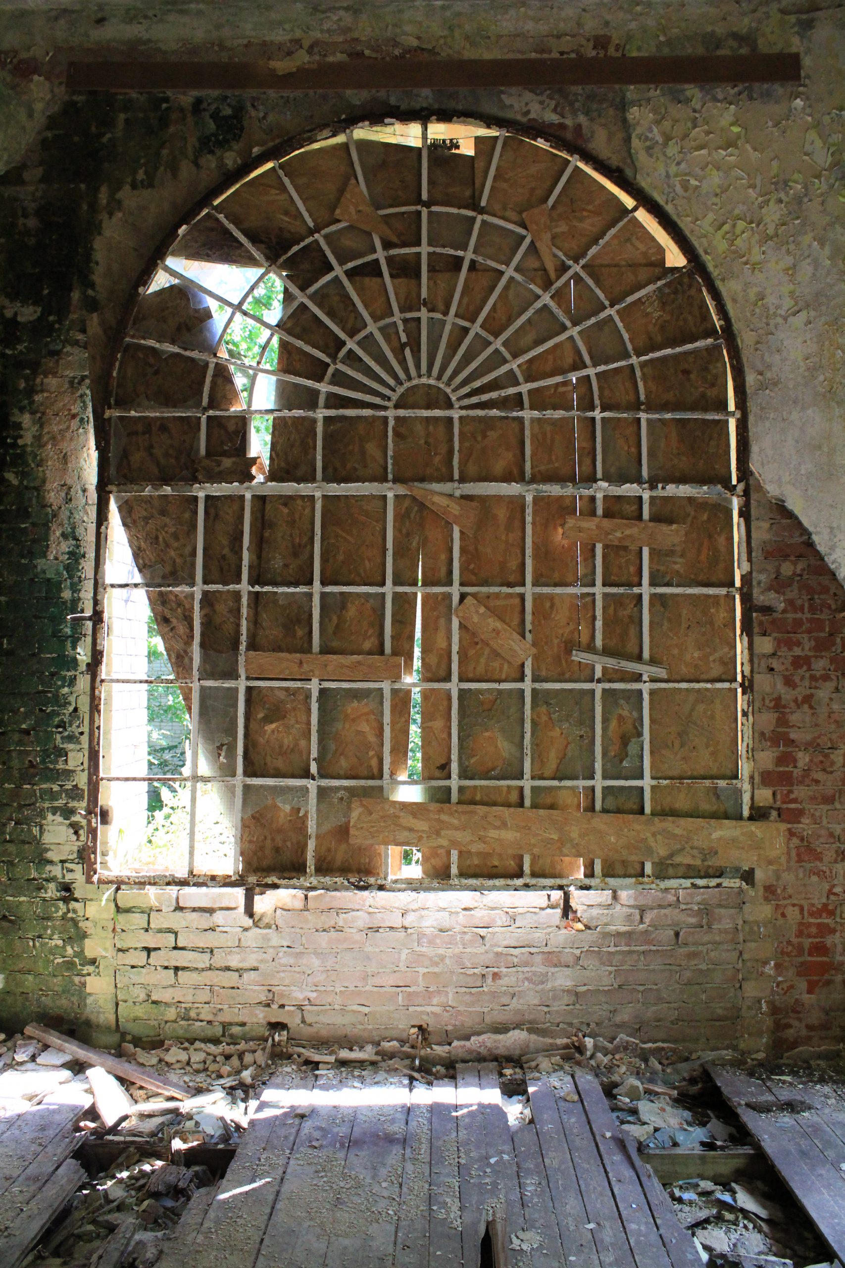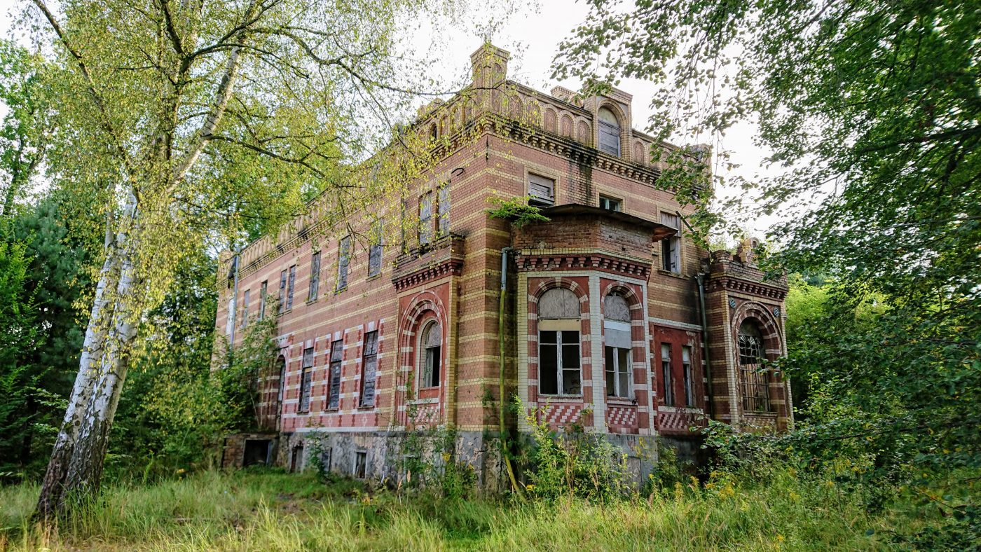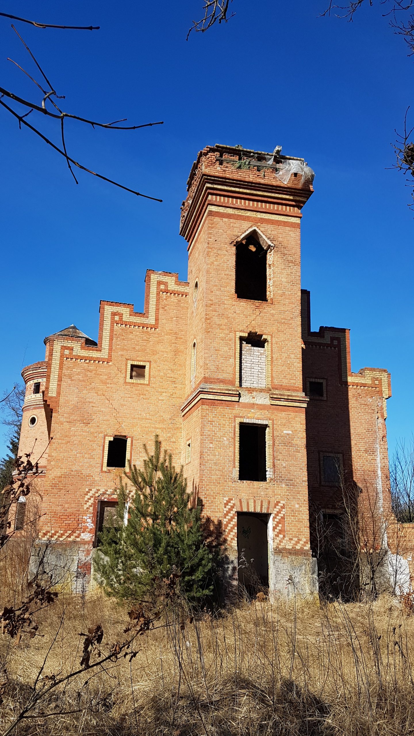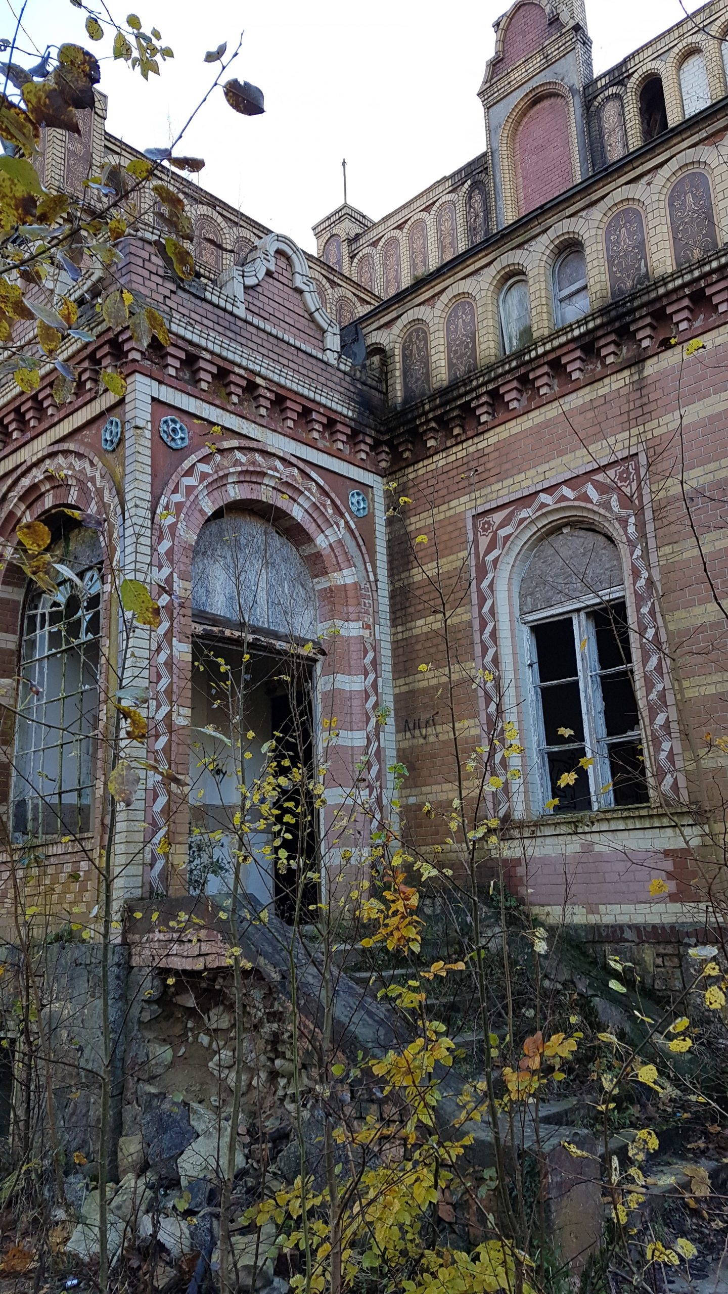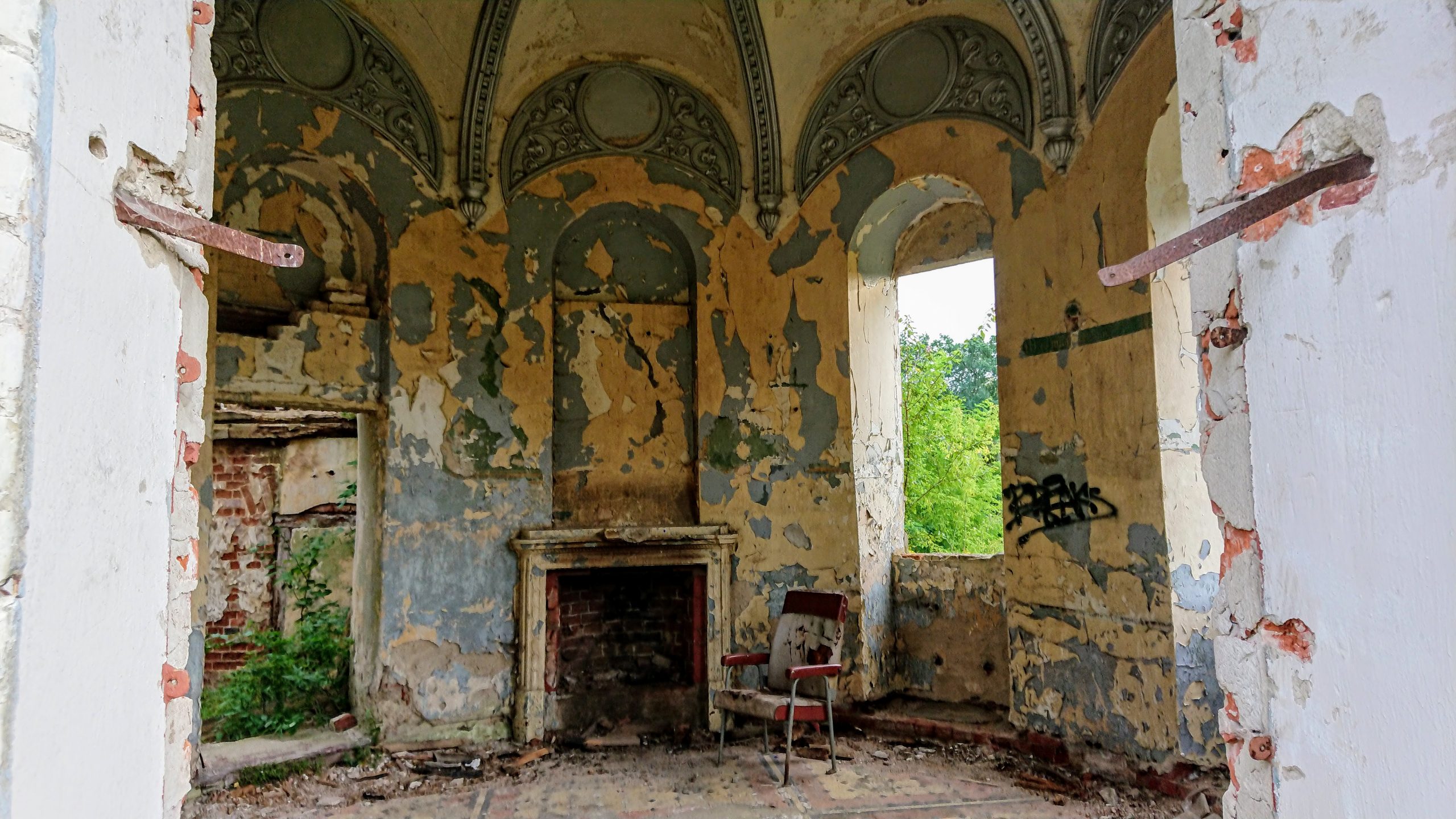 Überreste eines Ziegelkamins sind die einzigen Hinweise auf die frühere stilvolle Ehrwürdigkeit des Raumes. Ansonsten prägen Schwammpilze, aufgedunsenes Holz und Graffiti das Bild. In manchen der angrenzenden Räume ist die Decke heruntergekommen: riesige Balken hängen herab wie Mikadostäbe, durch die Decke und halb zugenagelten Fenster gelangt ein wenig Licht, in dessen Strahlen dichte Wolken aus Staubkörnern tanzen.