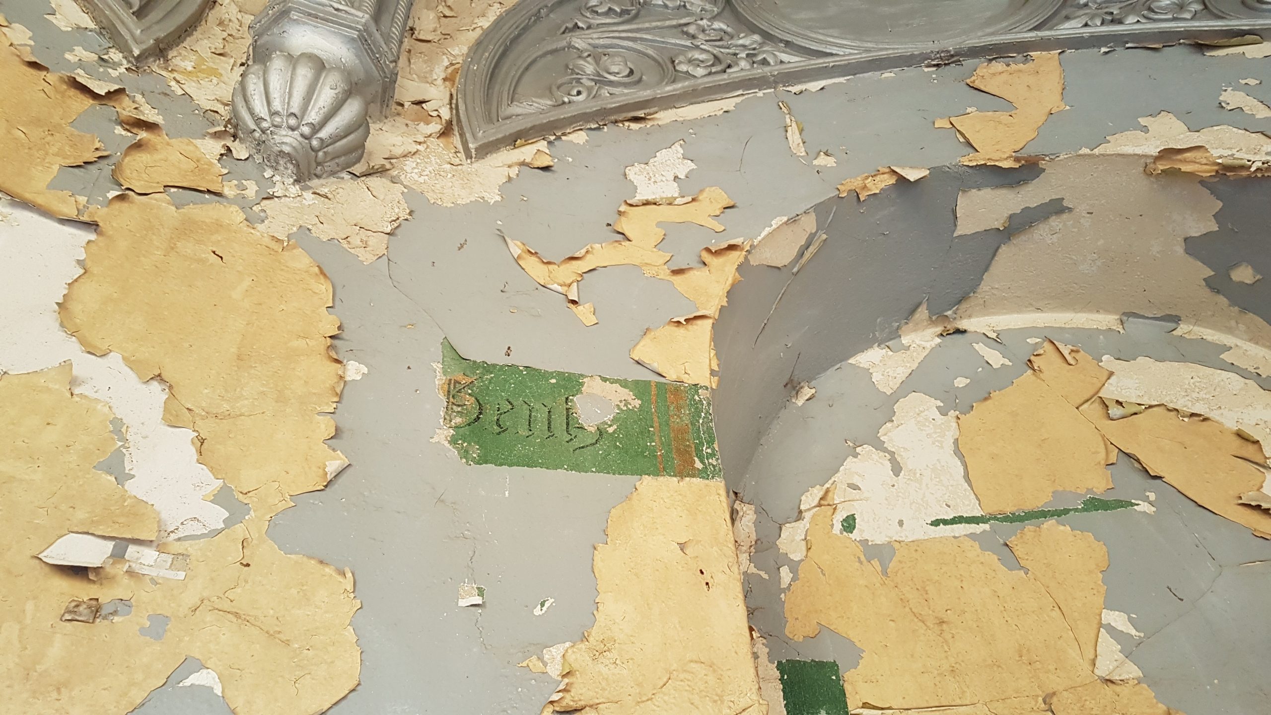 Grüner Schriftzug „Gentz“ an der Wand: Ehemaliger Salon im Wohnturm, 2017