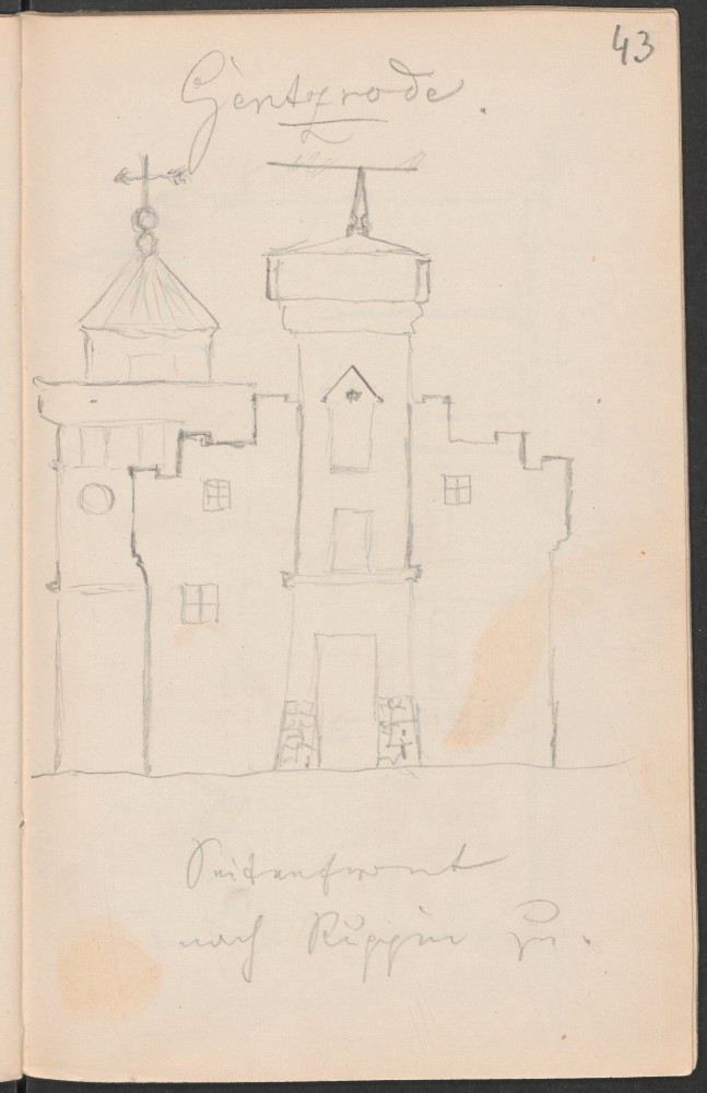 Fontane hat den Wohnturm während seines Besuches in Gentzrode 1864 in seinem Notizbuch gezeichnet. Dieser Aufenthalt war bisher nicht bekannt, weil man in der Forschung davon ausging, dass er erst 1873 – in Vorbereitung auf die dritte Auflage der „Grafschaft Ruppin“ von 1875 – nach Gentzrode gereist sei. Wie die Notizbuch-Edition nun aber belegt, hielt sich Fontane bereits im Sommer 1864 in Gentzrode auf, weil er über die Neuschöpfung der Familie Gentz in der zweiten Auflage von 1865 in dem Kapitel „Dörfer und Flecken im Lande Ruppin“ wenigstens kurz informieren wollte.