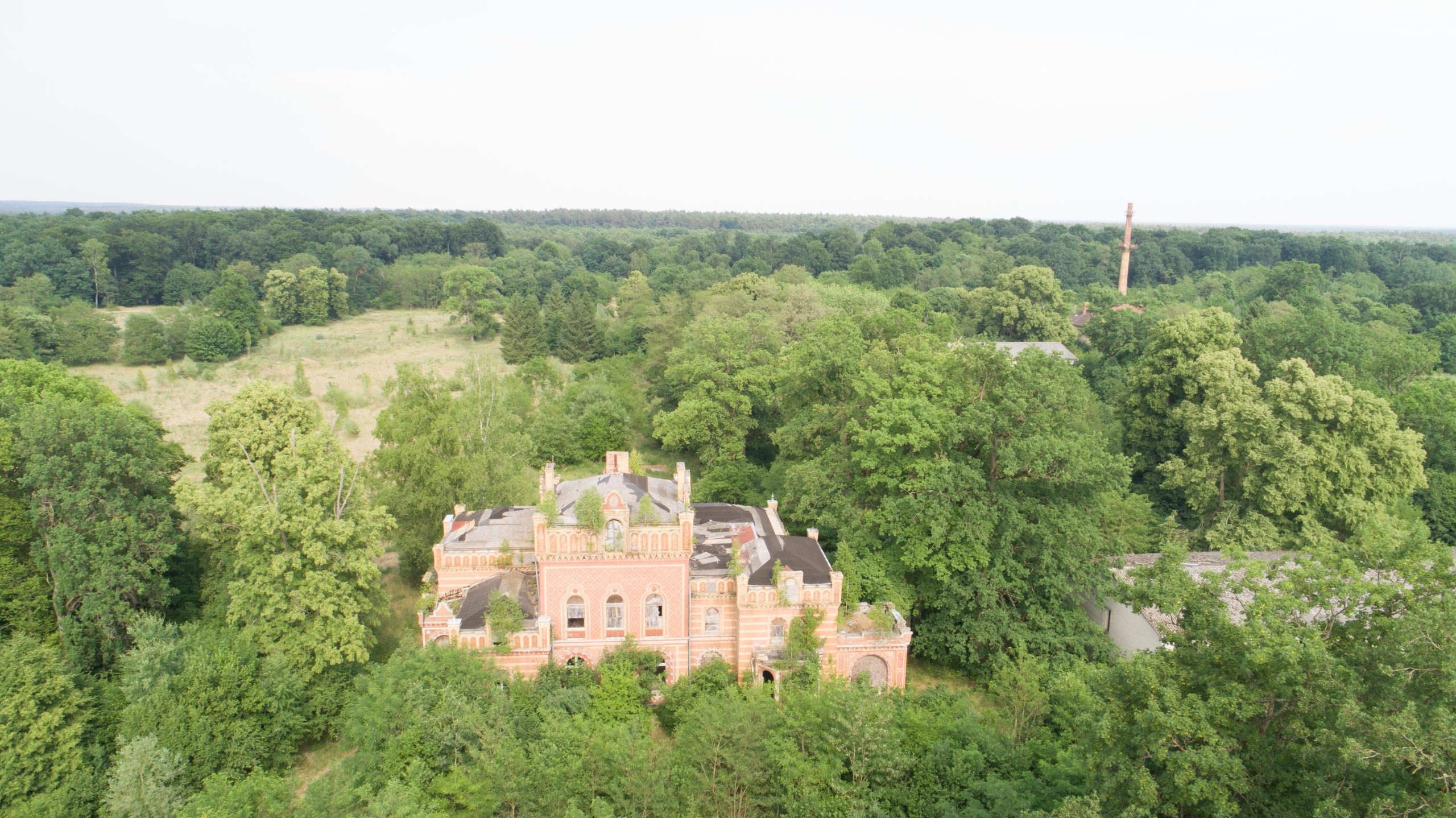 Einst als sowjetische Kaserne genutzt: Herrenhaus Gentzrode, Reste der Kasernenbauten (re. Bildhälfte) und der Schornstein des Heizhauses (re. im Hintergrund), 2018