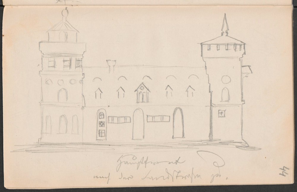 Kornspeicher mit Wohnturm, Fontanes Skizze, 1864 [Notizbuch A1, 44r]